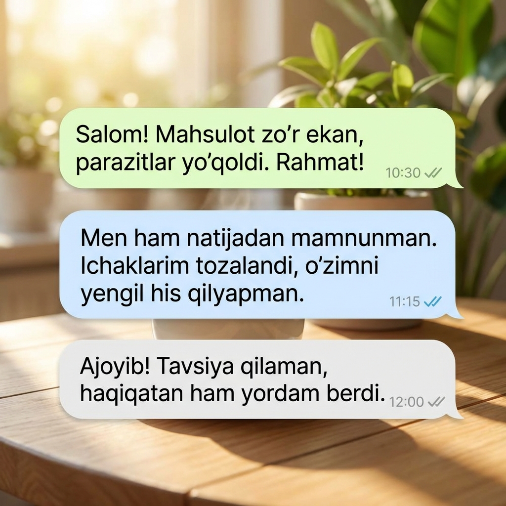 Клиник синовларда 5000 дан ортиқ бемор қатнашди. Натижалар шунчалик ҳайратланарли эдики, кўпчилик шифокорлар аввалига ишонишмади. Лекин таҳлиллар ёлғон гапирмайди: 98% ҳолатда паразитлар бутунлай йўқолди, қолган 2% да эса сезиларли камайиш кузатилди.